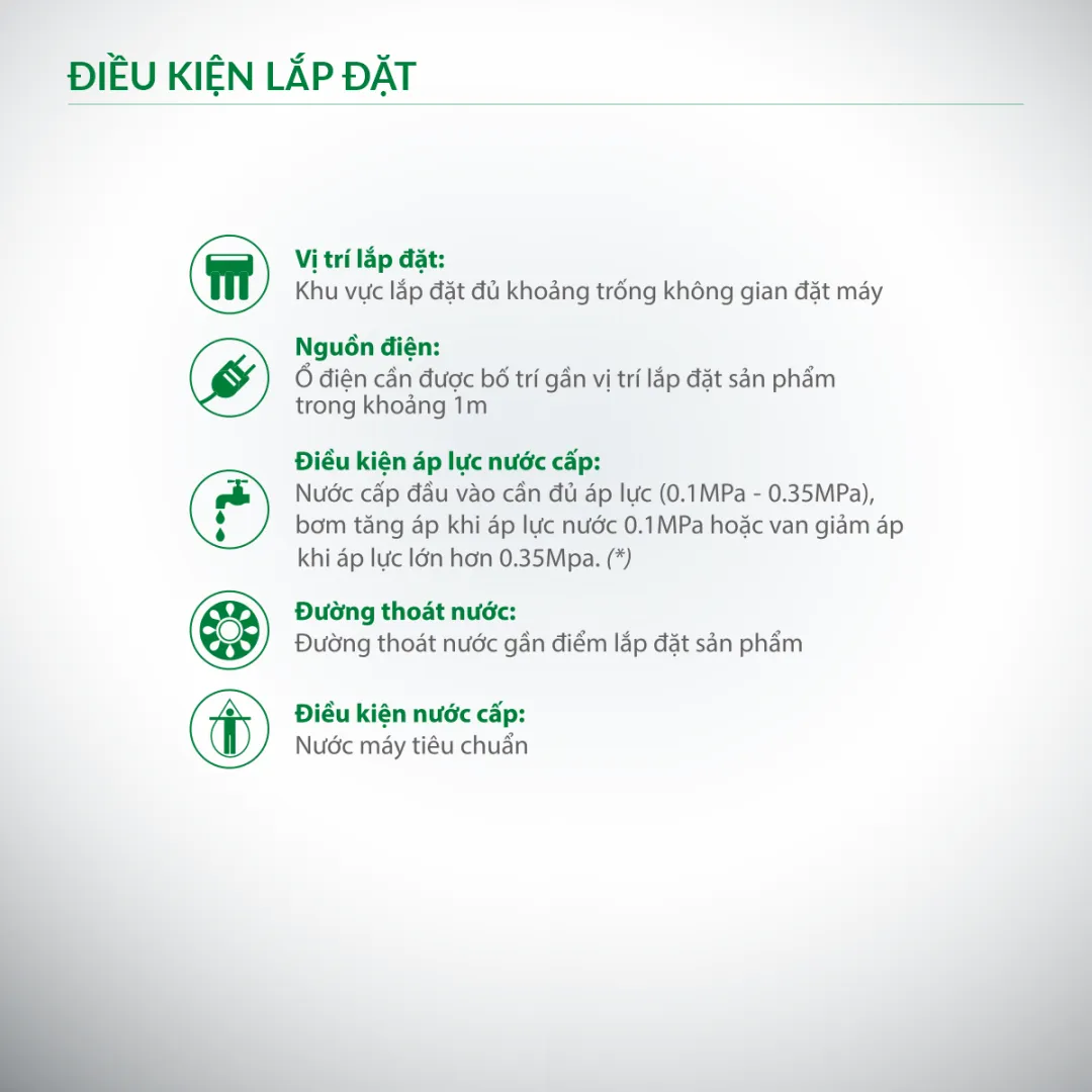 | Áp suất nước cấp phù hợp | 0.05 MPa – 0.2 MPa (7psi – 30psi) |