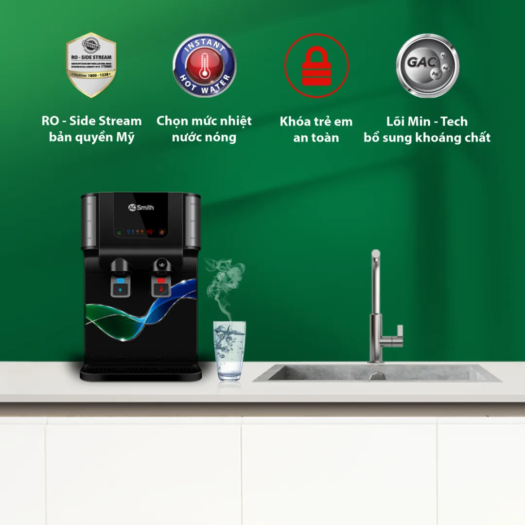 Máy lọc nước A. O. Smith P6 có 2 tính năng: nước nhiệt độ thường và làm nóng nhanh 2 chế độ nhiệt (45°C và 80°C), với dung tích bình chứa đến 9.2/0.8L (thường/nóng).
