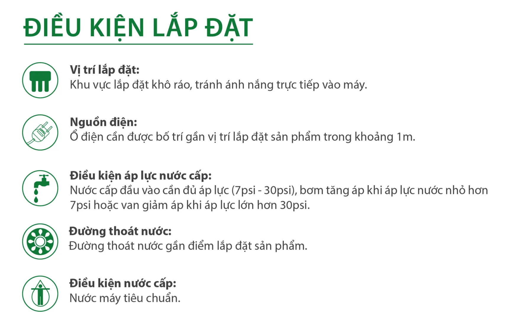 | Áp suất nước cấp phù hợp | 0.05 MPa – 0.2 MPa (7psi – 30psi) |