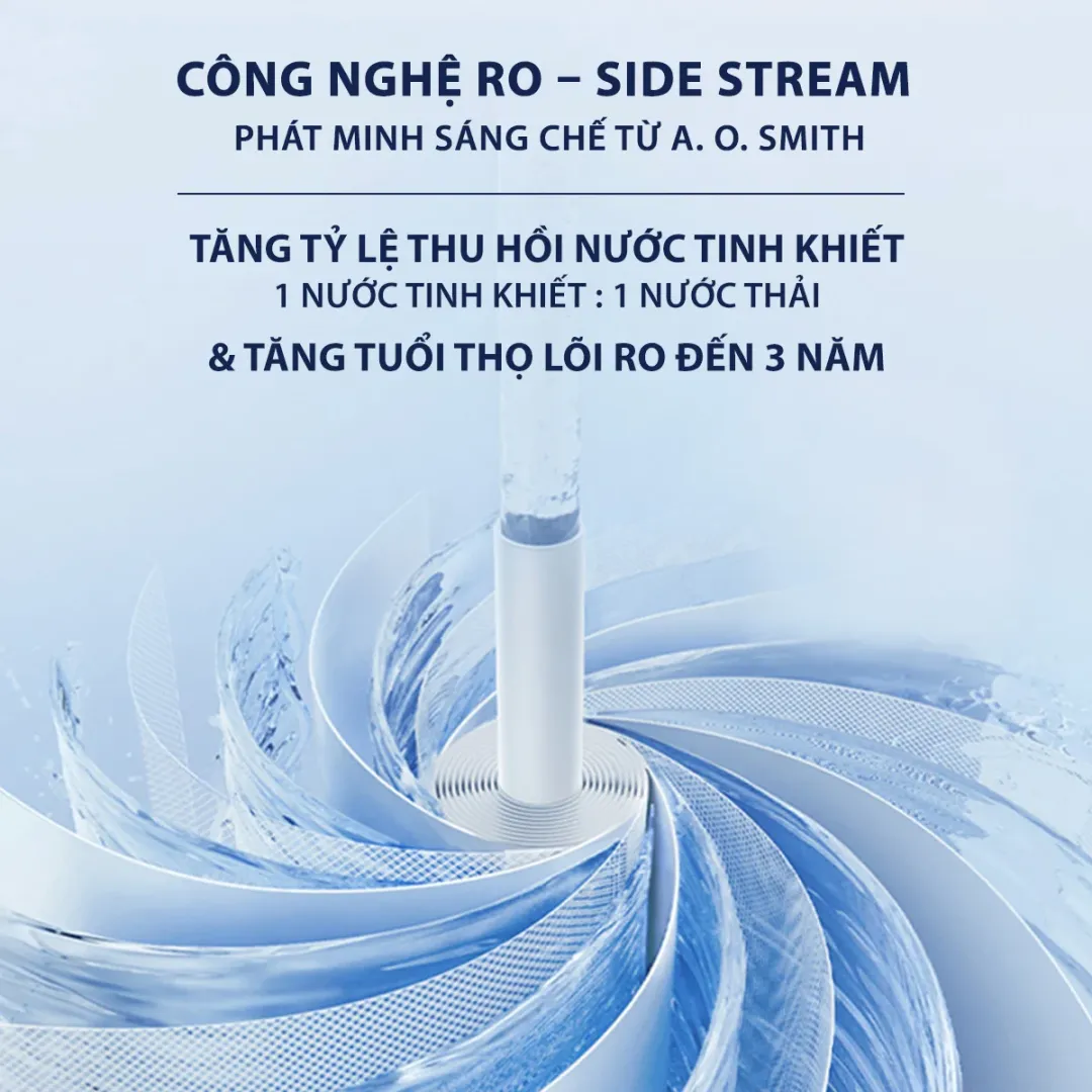 Màng lọc RO – Side Stream là phát minh của A. O. Smith, được cấp bản quyền sáng chế tại Mỹ (patent US8,337,698 B2), giúp nâng cao tỷ lệ thu hồi nước tinh khiết : nước thải là 1:1 và kéo dài tuổi thọ lõi lọc, mang đến “Giải pháp tiết kiệm toàn diện” cho người sử dụng. Màng lọc RO – Side Stream loại bỏ tạp chất, kim loại nặng (Asen, chì, thủy ngân…) và các vi khuẩn, vi rút có hại.