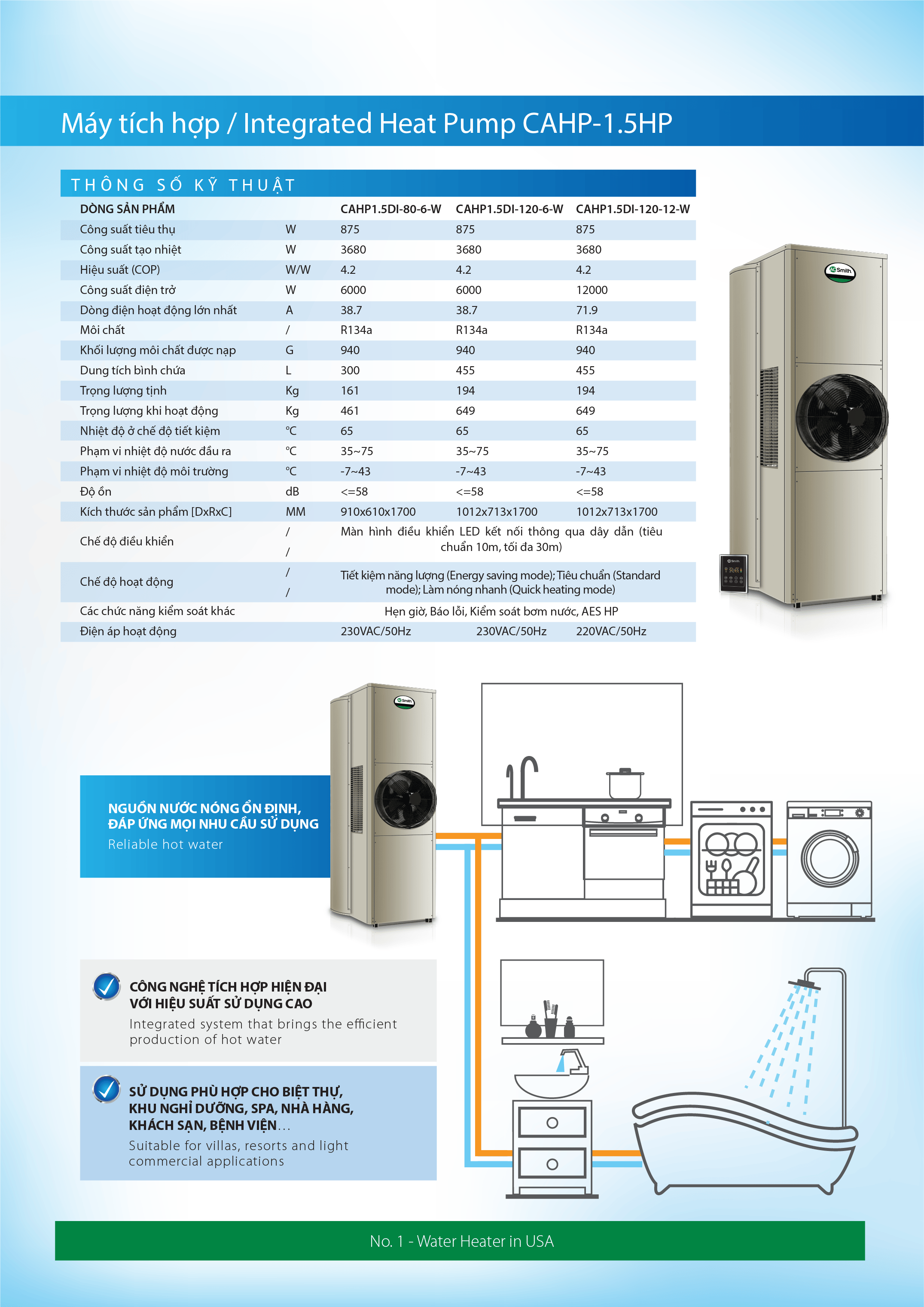 Đánh giá Máy nước nóng bơm nhiệt tích hợp A. O. Smith CAHP-1.5HP CAHP1.5DI-120-6-W